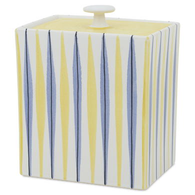 Fayence weiß gelbe Bänder und blaue Striche Glasur glänzend