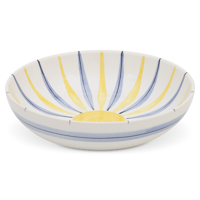 HB faience is created by inglaze painting. After the first firing, a white covering glaze is applied to the ceramics. After drying, our ceramic painters, some of whom were trained by Hedwig Bollhagen, hand-paint their famous colored faience decorations into the glaze. In the so-called smooth firing, the glaze combines with the decor painted with engobe and fixes it. The ceramic "safe" colors form the classics with blue, yellow and black. Red is considered a "volatile color" and often fades in the smooth firing. All colors belong to Hedwig Bollhagen's typical faience decors, which are to be understood as a homage to the farmer's pottery that she so admired.