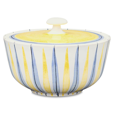 La lata de Hedwig Bollhagen, con el número de modelo «880», destaca en varias variantes de diseño. Este conjunto de dos piezas, compuesto por el recipiente y la tapa, se caracteriza por su cuerpo cónico y redondeado en la parte inferior, y por la tapa plana y redonda con un pomo en forma de seta incorporado. Con un diámetro de 15 centímetros y una altura de 10 centímetros, esta lata de 600 gramos de peso no es ni demasiado grande ni demasiado pequeña. Una cosa es segura: esta lata de cerámica no solo presenta con estilo la mermelada, el chutney y demás delicias de la abuela en la mesa del desayuno, sino que también oculta de forma segura y elegante los dulces caseros ante los pequeños golosos.