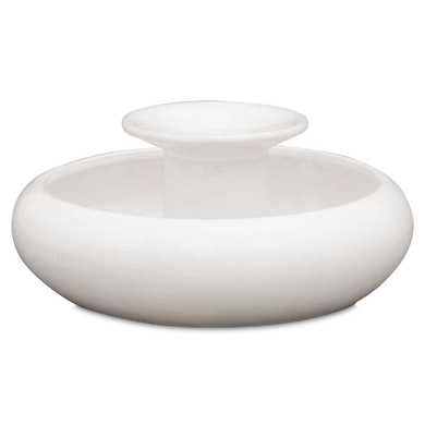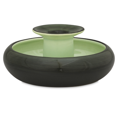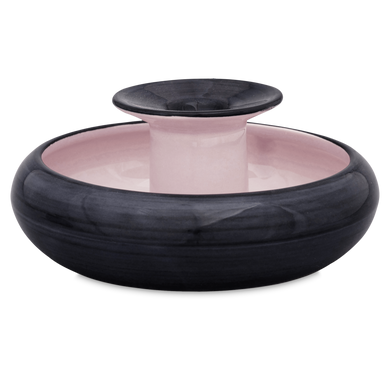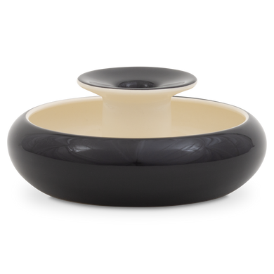 La lámpara de Hedwig Bollhagen, con el número de modelo «215», recuerda a una mezcla entre un platillo volante y una seta invertida. Se caracteriza por su cuerpo redondeado y convexo, con una lámpara cilíndrica en forma de chimenea en el centro que se ensancha hacia arriba en forma de cono hasta llegar al portavelas. Con un diámetro de 14 centímetros, este candelabro de seis centímetros de altura es más del doble de ancho que de alto. Con un peso de 750 gramos, este candelabro no solo es uno de los más pesados de la gama, sino que también se mantiene firme y estable. Y si alguna vez, con una ráfaga de viento, gotea cera, el platillo integrado evita las molestas manchas. Lo bonito es, sencillamente, lo que funciona.