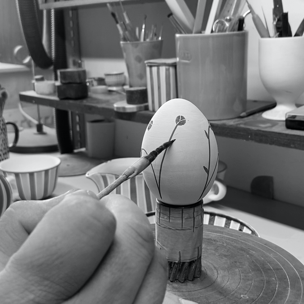 The ceramic Easter egg by Hedwig Bollhagen, model number "752," exudes an Easter festive spirit and charms with its timeless design. This lovingly handcrafted and hand-painted Easter decoration adds a delightful touch of nostalgia to both interiors and gardens. With a diameter of 4 centimeters, the 5.5-centimeter-tall Easter Egg 752 features an authentically curved design and can be easily hung thanks to the eyelet on top. Weighing just 20 grams, this Easter egg is crafted from delicate yet durable ceramic and is perfect for creating beautiful Easter bouquets or decorating the Easter tree. Discover also the slightly larger version, Easter Egg 753, which is wonderful for combining with other pieces.